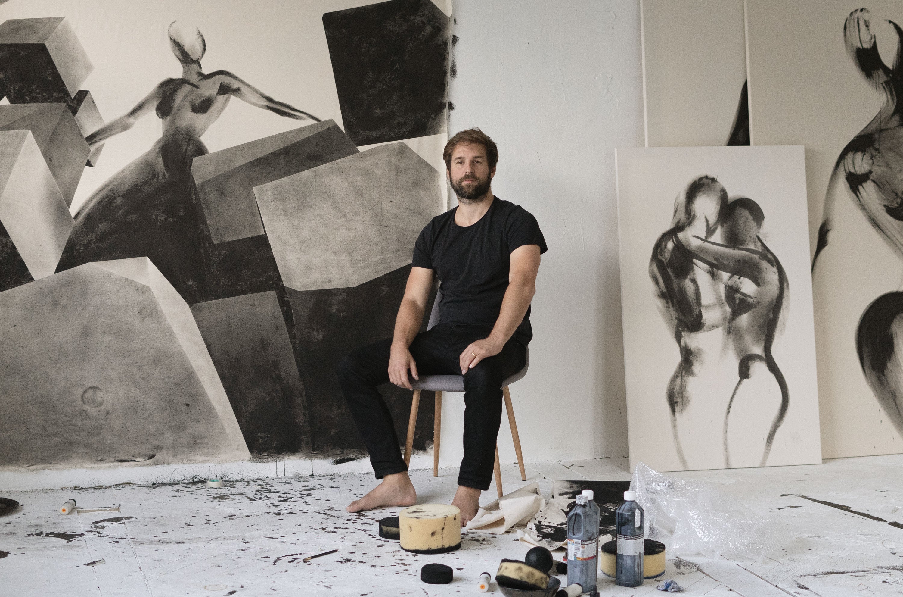At the core of his personal artistic practice lies black ink painting — an exploration of form, presence, and transformation. Working mainly with ink on cotton canvas, Sodoma creates figurative works that emerge in a single, uninterrupted flow. His aim is not literal representation but resonance — a visual language that touches on the body, space, impermanence, and inner change. His paintings are meditative yet bold, inviting introspection and emotional response.