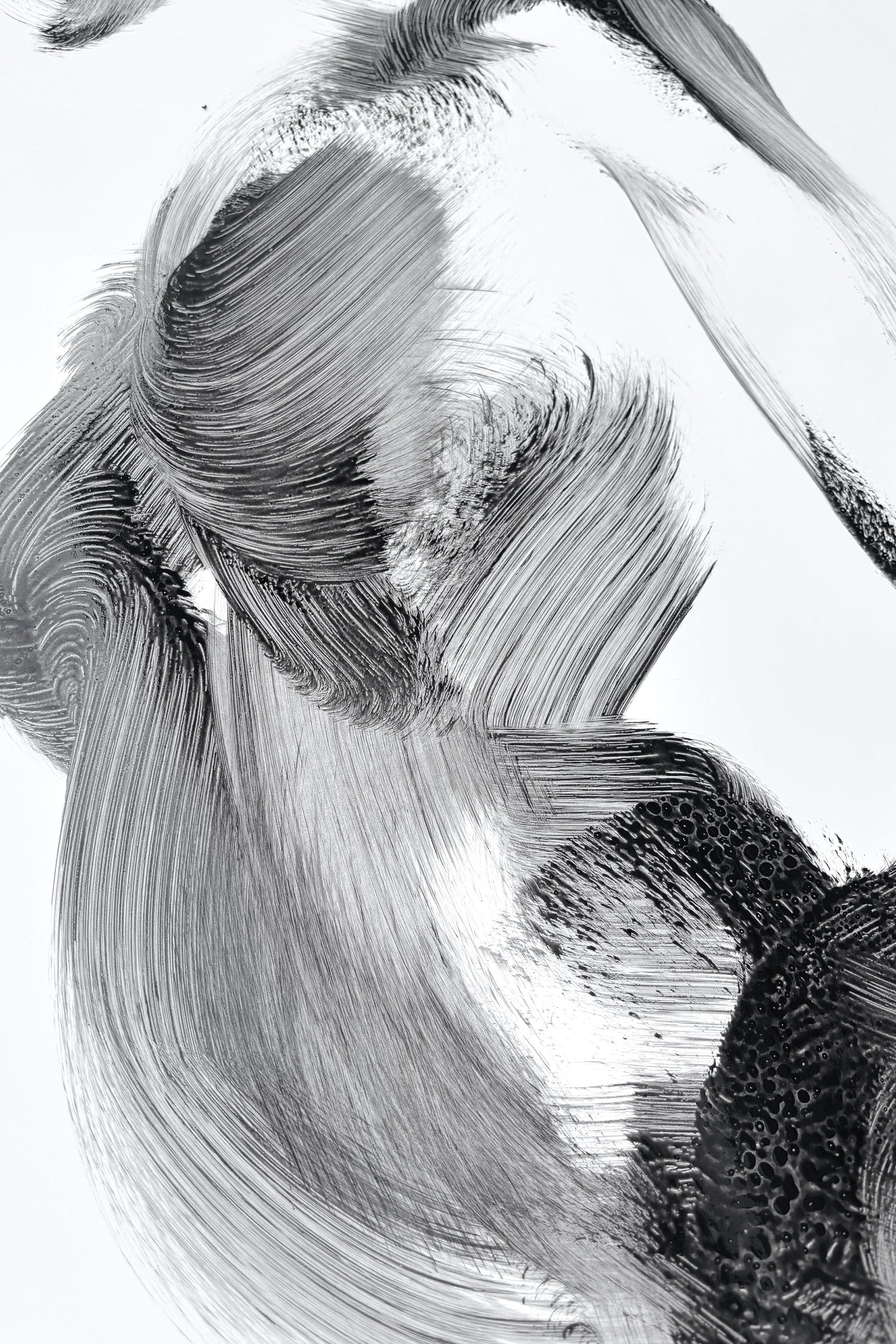 Original ink painting on paper by Milan Sodoma, created spontaneously without sketches or preparation. Stylized female figure made of bold black brushstrokes on a white background, balancing softness and strength.