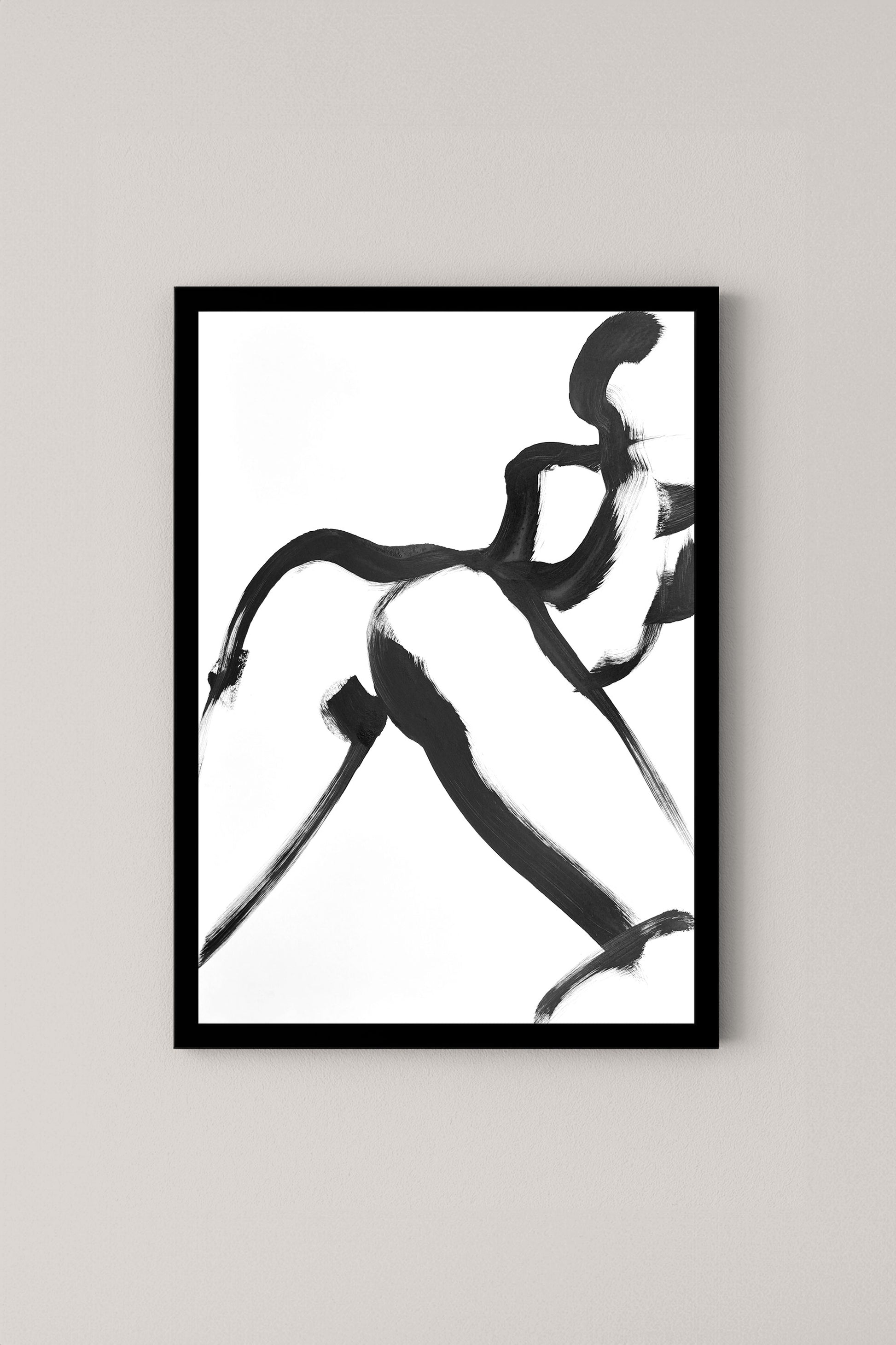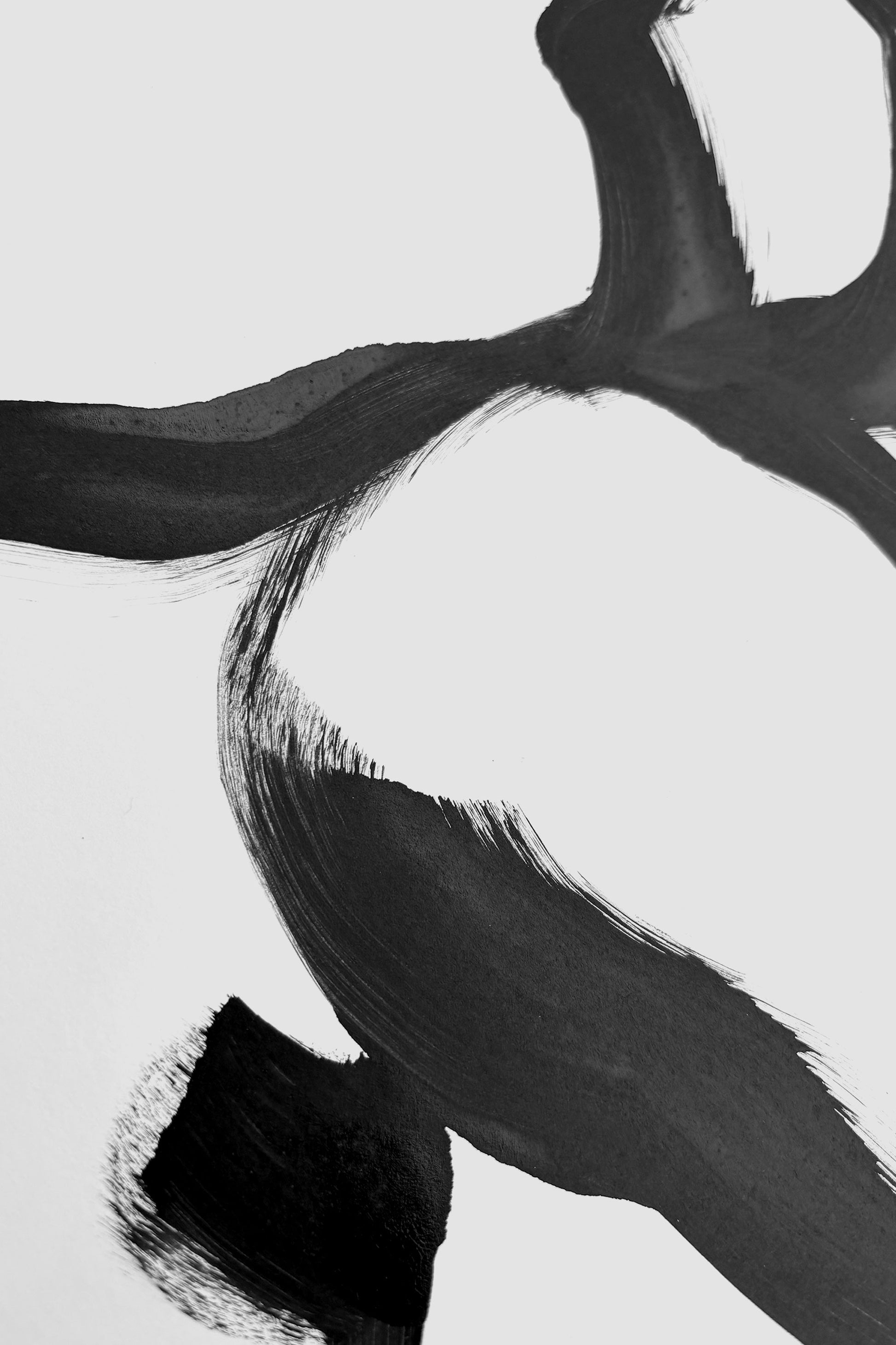 Original ink painting on paper by Milan Sodoma, created spontaneously without sketches or preparation. Stylized female figure made of bold black brushstrokes on a white background, balancing softness and strength.