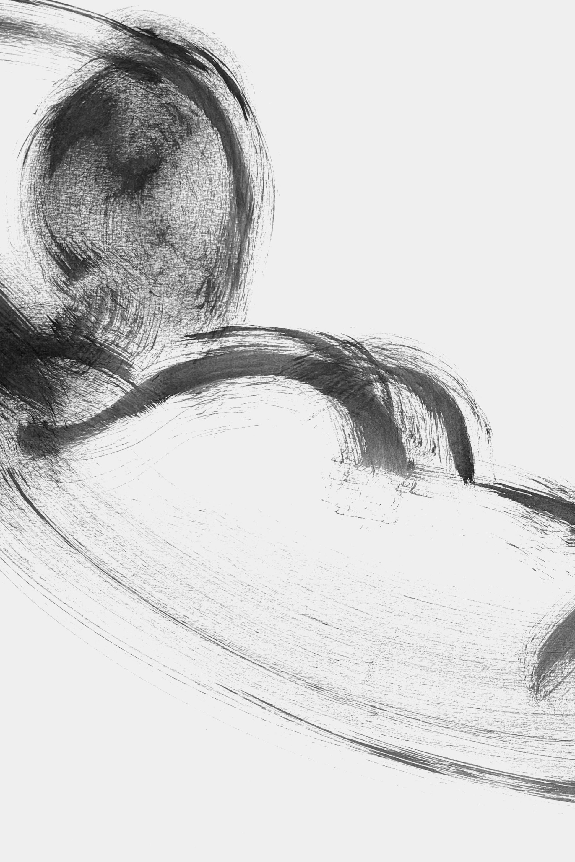 Original ink painting on paper by Milan Sodoma, created spontaneously without sketches or preparation. Stylized female figure made of bold black brushstrokes on a white background, balancing softness and strength.