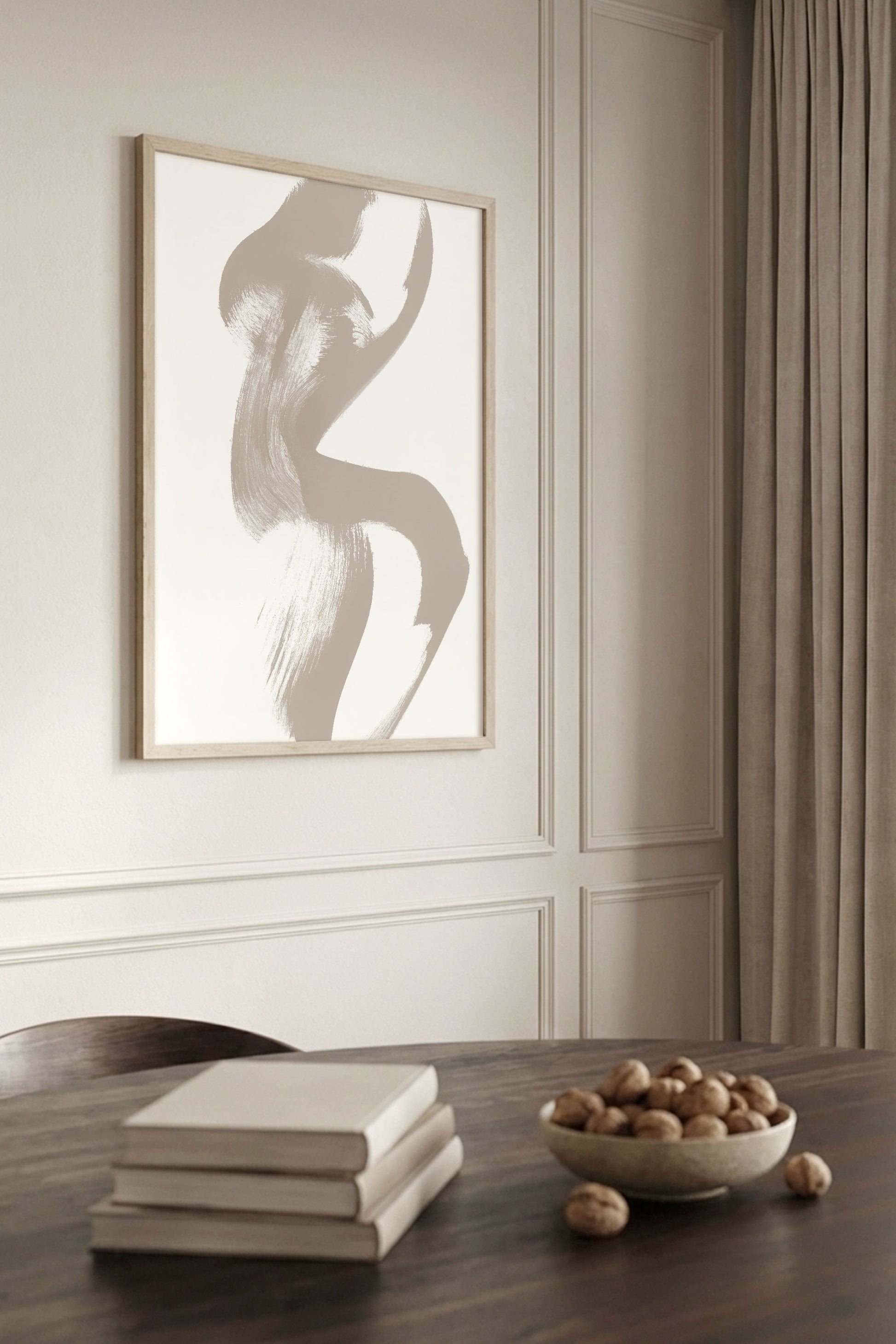 An elegant beige framed poster featuring an abstract female silhouette, originally painted with ink on paper. This art print captures femininity, movement, and strength in a minimalist, expressive style.