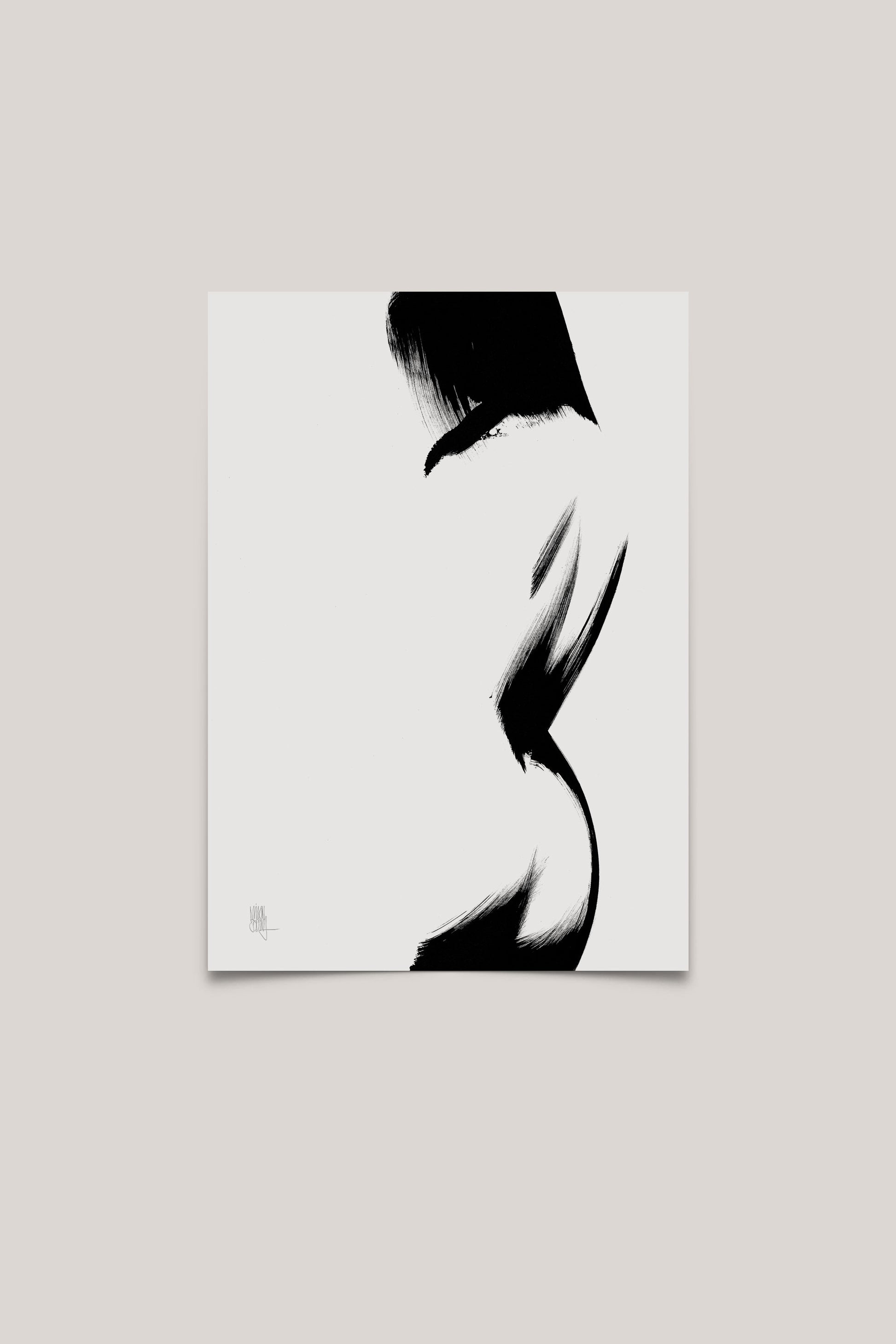 An elegant black-and-white poster featuring an abstract female silhouette, originally painted with black ink on paper. This art print captures femininity, movement, and strength in a minimalist, expressive style.