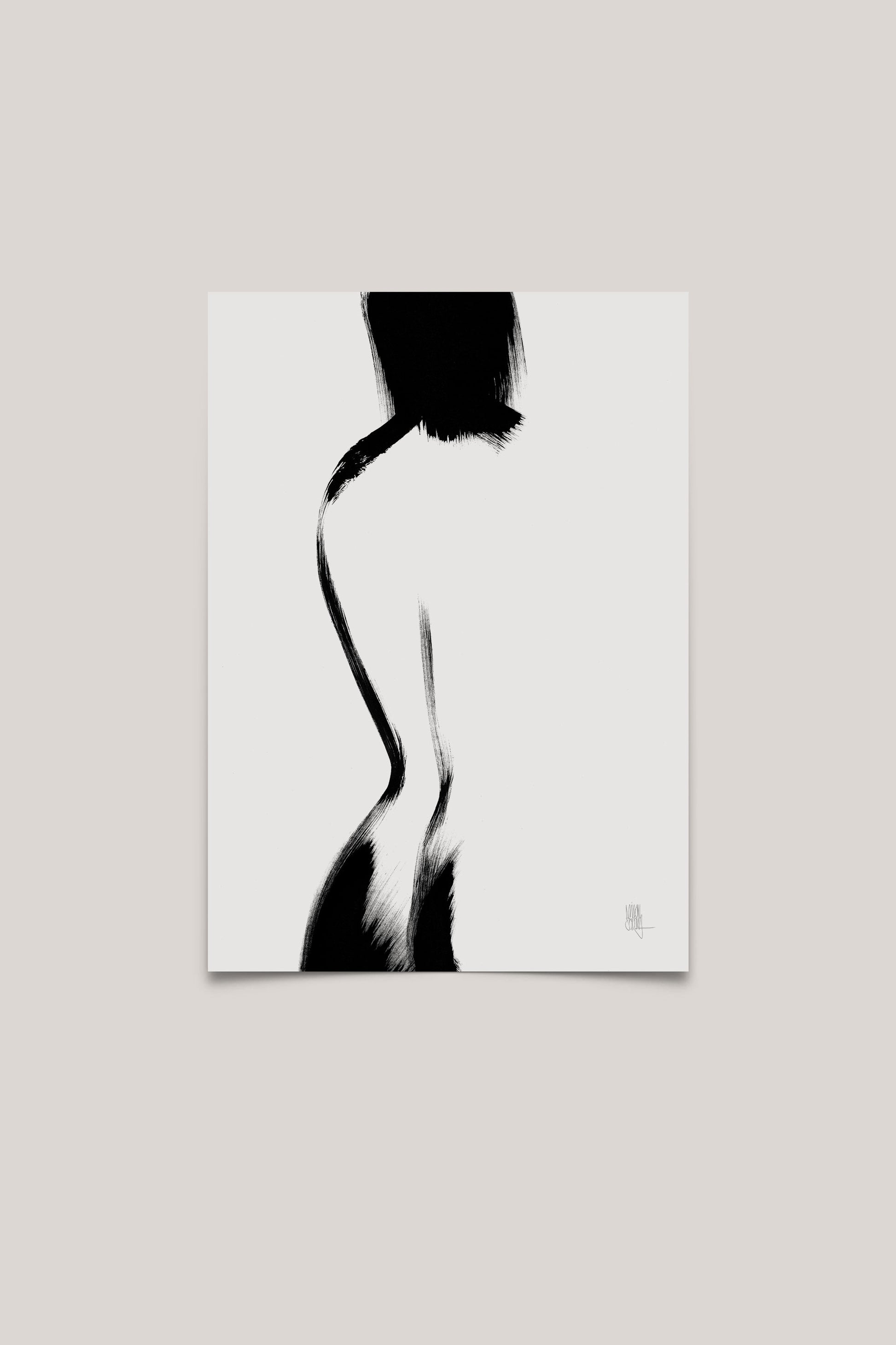 An elegant black-and-white poster featuring an abstract female silhouette, originally painted with black ink on paper. This art print captures femininity, stillness, and strength in a minimalist, expressive style.