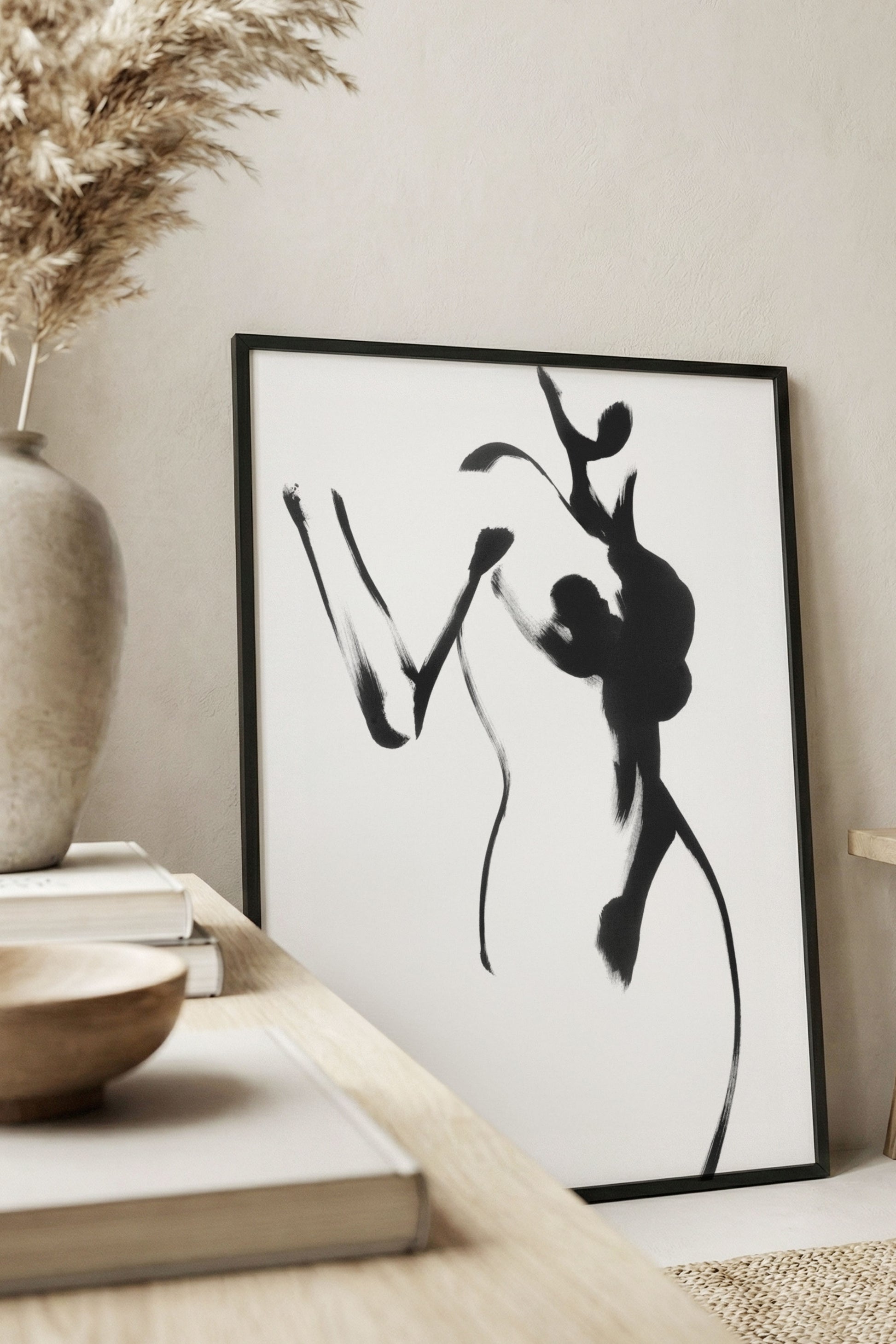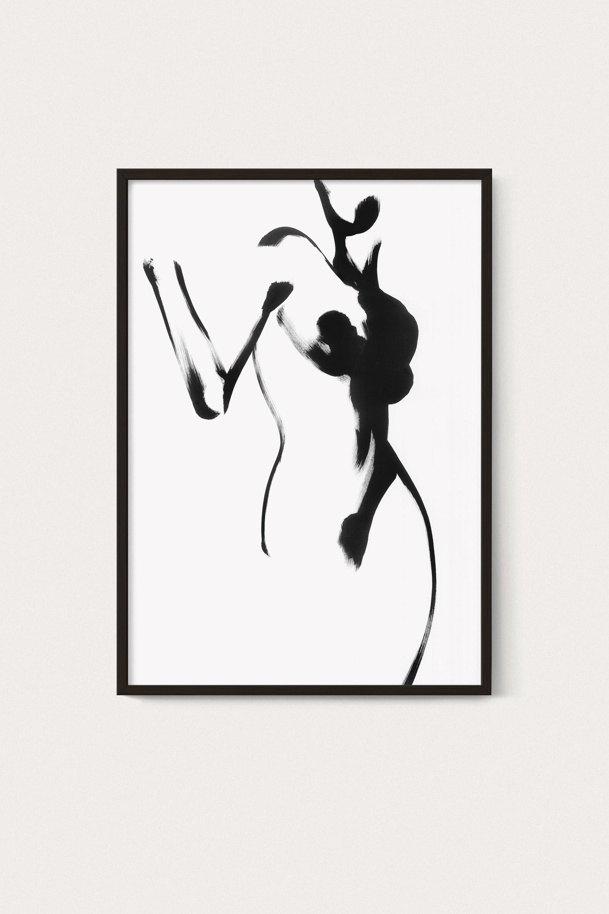 An elegant beige framed poster featuring an abstract female silhouette, originally painted with ink on paper. This art print captures femininity, movement, and strength in a minimalist, expressive style.